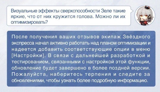 Компания HoYoverse опубликовала ответы на вопросы геймеров и поделилась планами на будущие обновления Honkai: Star Rail. Среди обращений к разработчикам нашлось место для жалобы на слишком яркие эффекты от специальной способности героини Зеле. Студия пообещала исправить эту проблему, добавив в клиент возможность регулировать яркость атак: