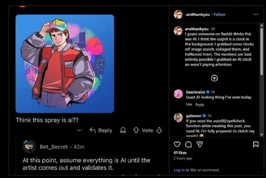 А вот граффити с Марти из «Назад в будущее» — это всё же авторская работа. Но художник признаётся, что часы на фоне он нашёл в сети, и они могли быть сгенерированы.