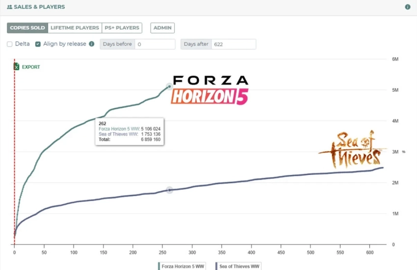 Сравнение продаж Forza Horizon 5 и Sea of ThievesИсточник: Alinea Analytics