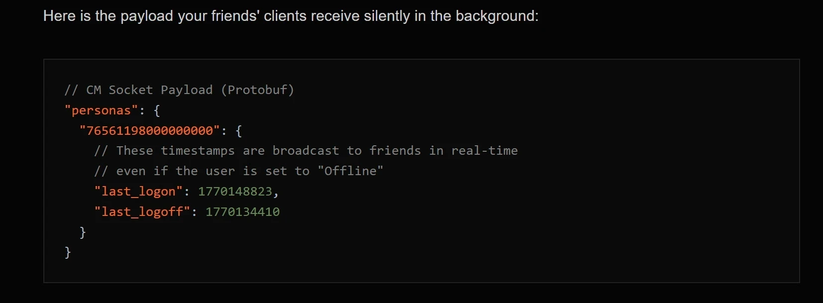По словам xmrcat, в любом из режимов Steam отмечает и отправляет на серверы Valve данные о времени последней авторизации в учётной записи игрока и выхода из сети. Эту информацию скрытно получают все пользователи из списка друзей, однако посмотреть её могут лишь рукастые умельцы — xmrcat показал пример соответствующих строчек кода.
