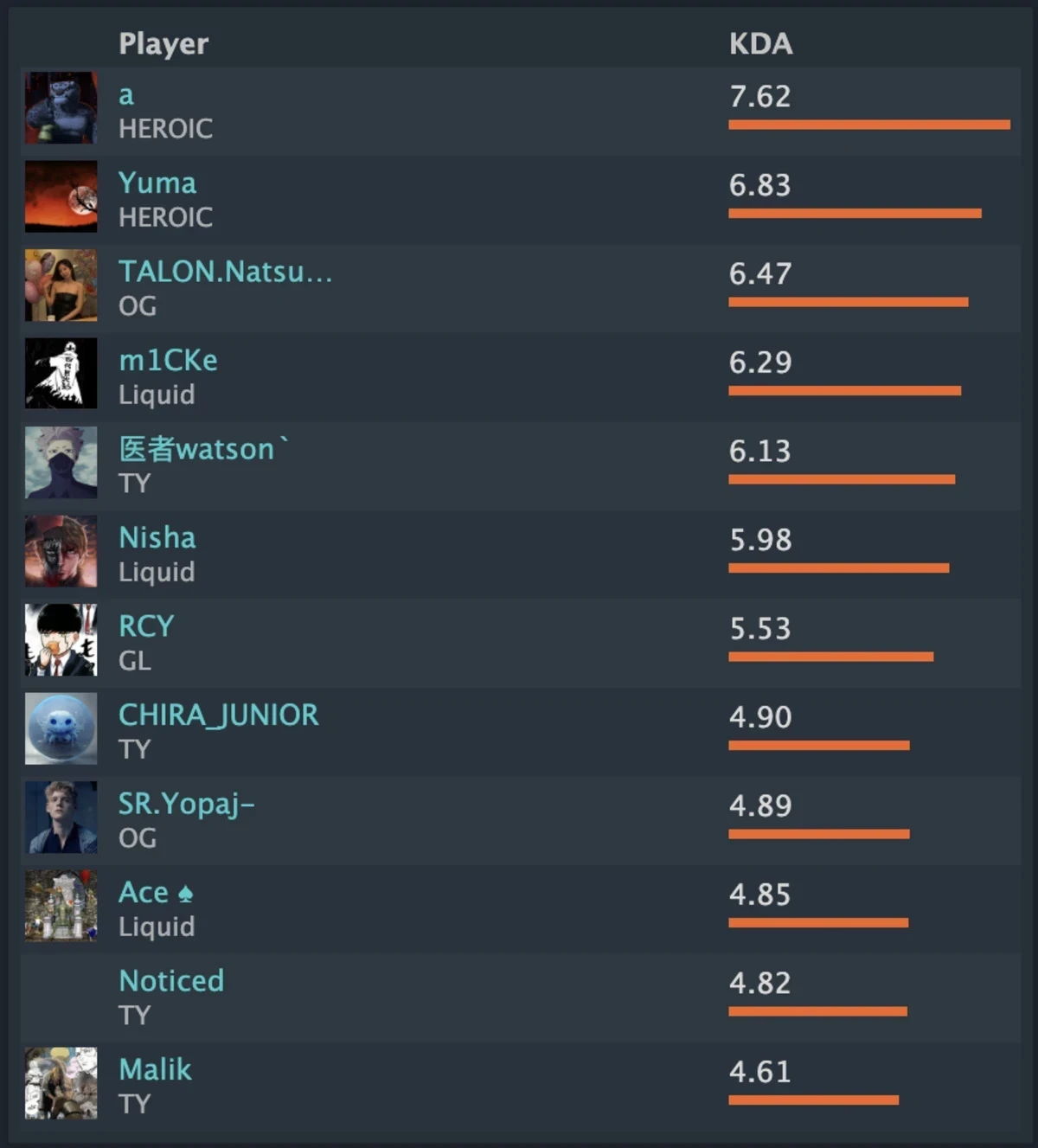 Лидером рейтинга стал мидер HEROIC Сантьяго «TaiLung» Агуеро Густаво (в таблице указан под ником «a»).