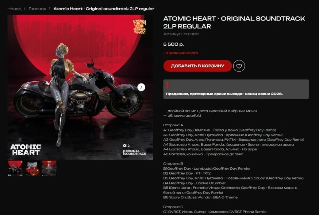 Релиз винилового саундтрека запланирован на конец осени 2026 года. Тем временем финальное, четвёртое дополнение для Atomic Heart выйдет уже 16 апреля.